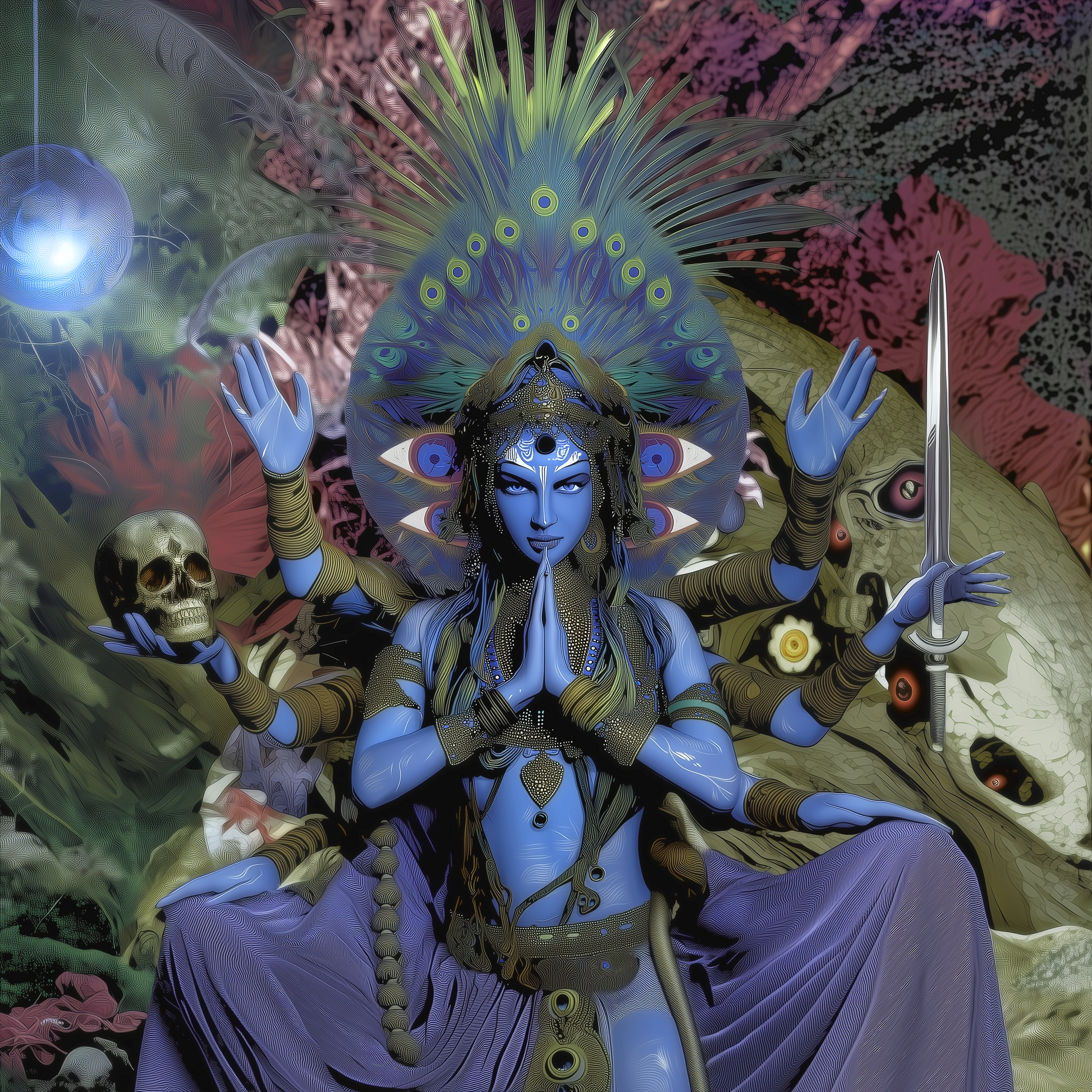 A striking multi-armed, blue-skinned goddess sits in commanding stillness, yet radiates unstoppable power. Her calm, prayer-like hands at the center suggest focus and inner strength, while the other arms extend outward, each carrying symbolic objects: a sword for truth and defense, a skull for mortality and transformation, and open palms offering both warning and blessing. Behind her, a brilliant fan of peacock feathers arcs upward, its many “eyes” evoking wisdom and vision that sees beyond illusion. The background swirls with cosmic textures — deep greens, purples, and otherworldly light — adding to the supernatural atmosphere.